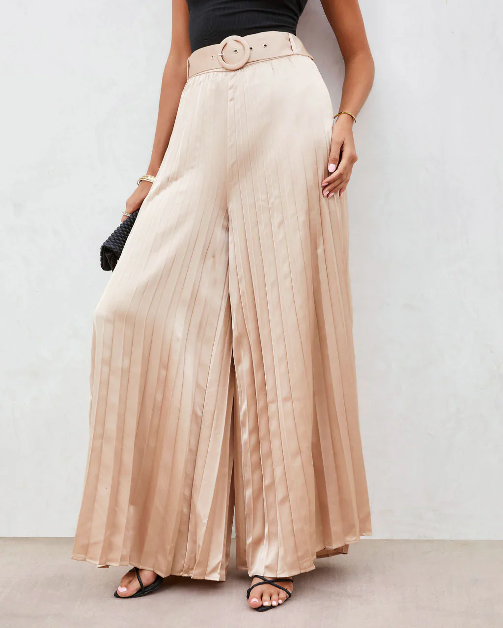 True Elegance Satin Pleated Belted Wide Leg Pants
