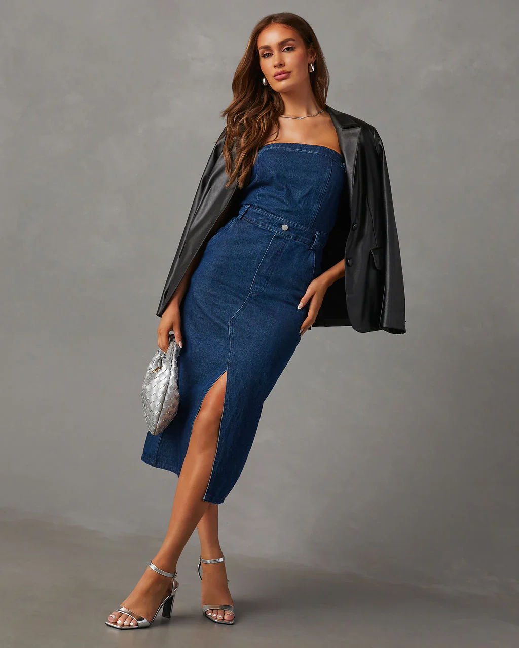 Edgy Era Denim Strapless Midi Dress