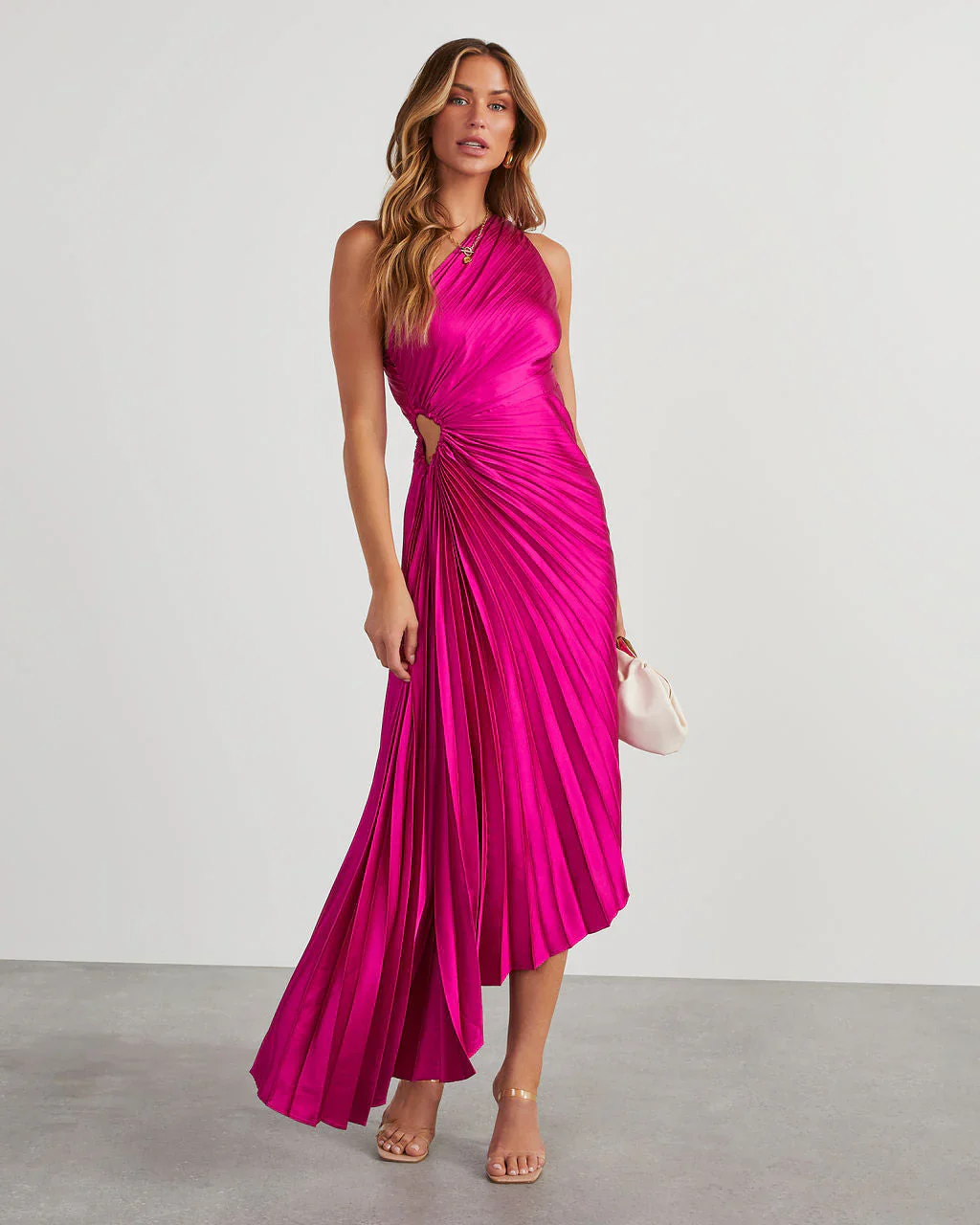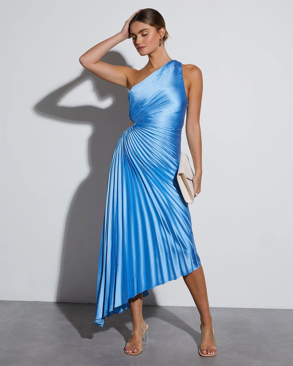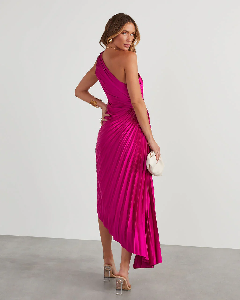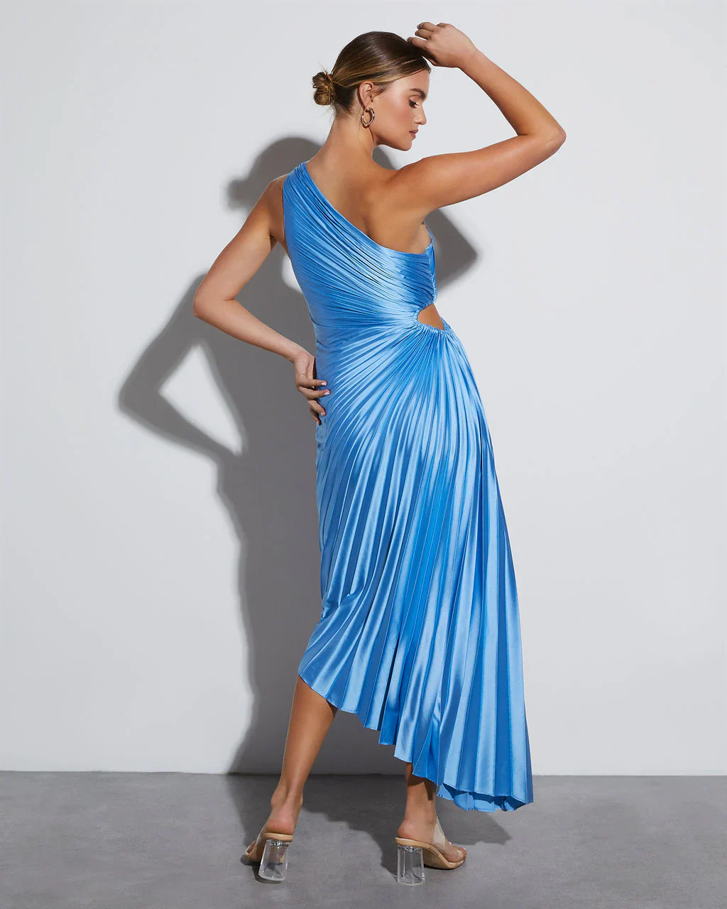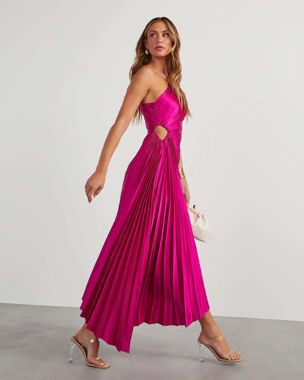 Modern Day Glam Satin Pleated One Shoulder Cutout Asymmetrical Maxi Dress