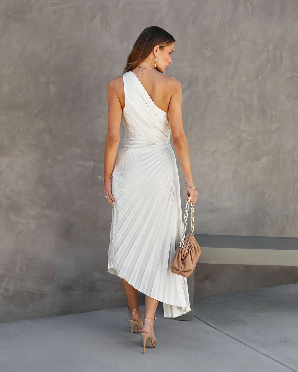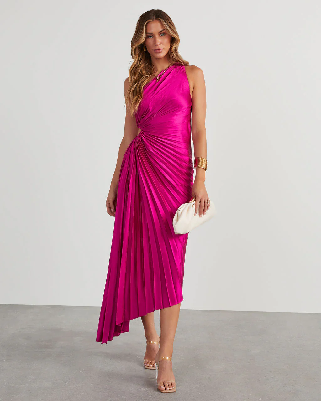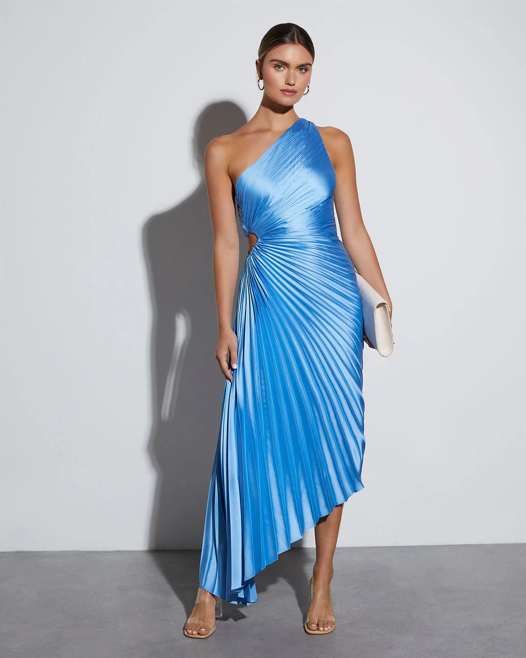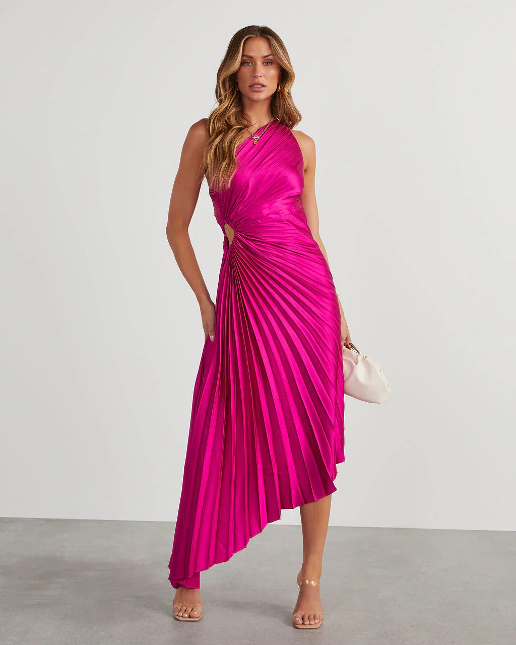 Modern Day Glam Satin Pleated One Shoulder Cutout Asymmetrical Maxi Dress