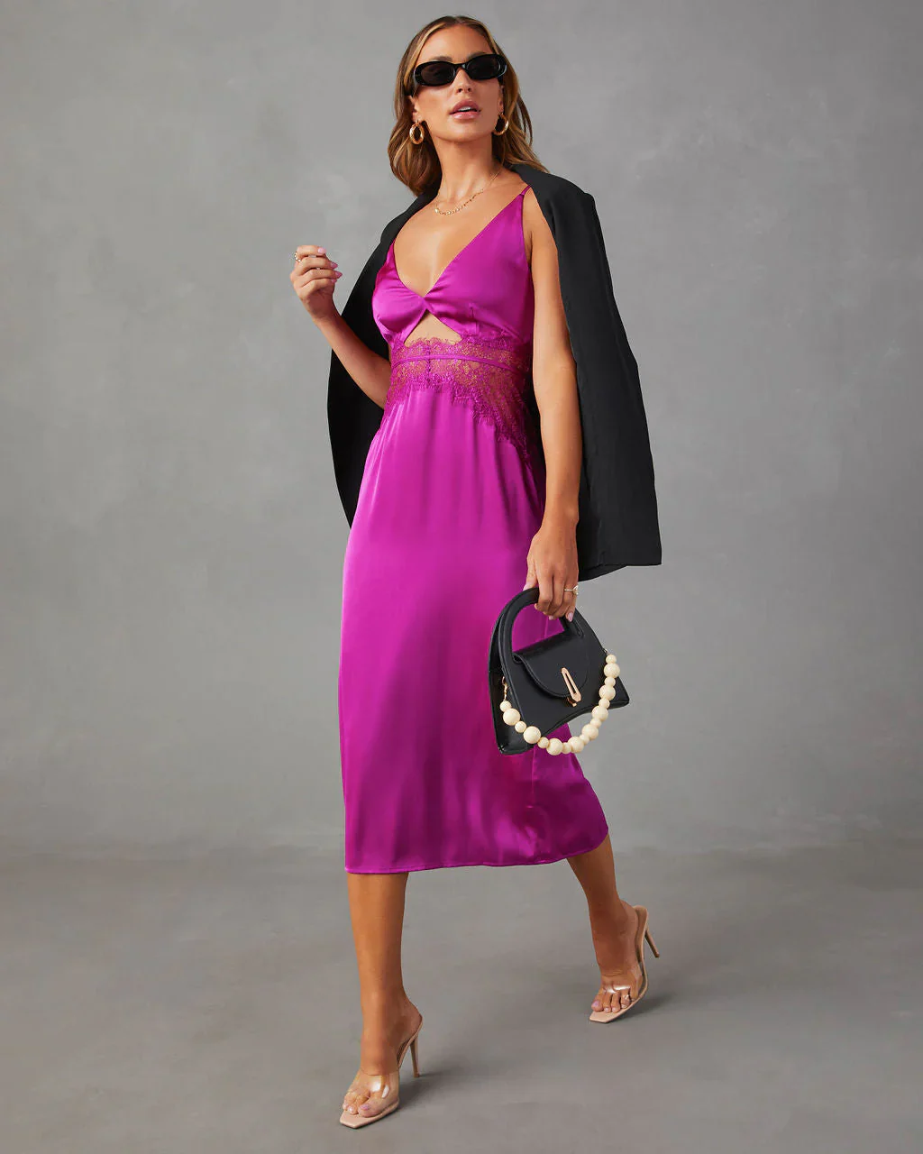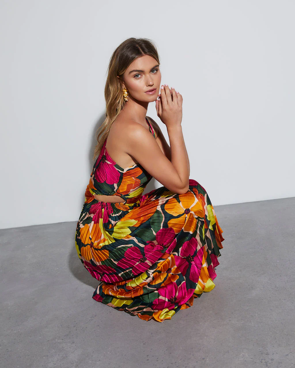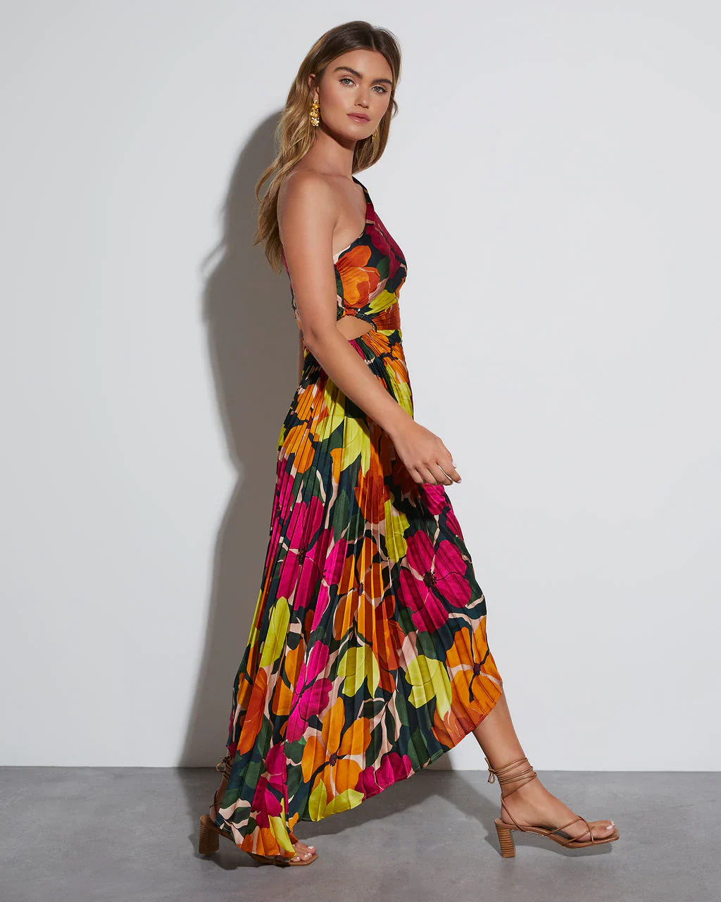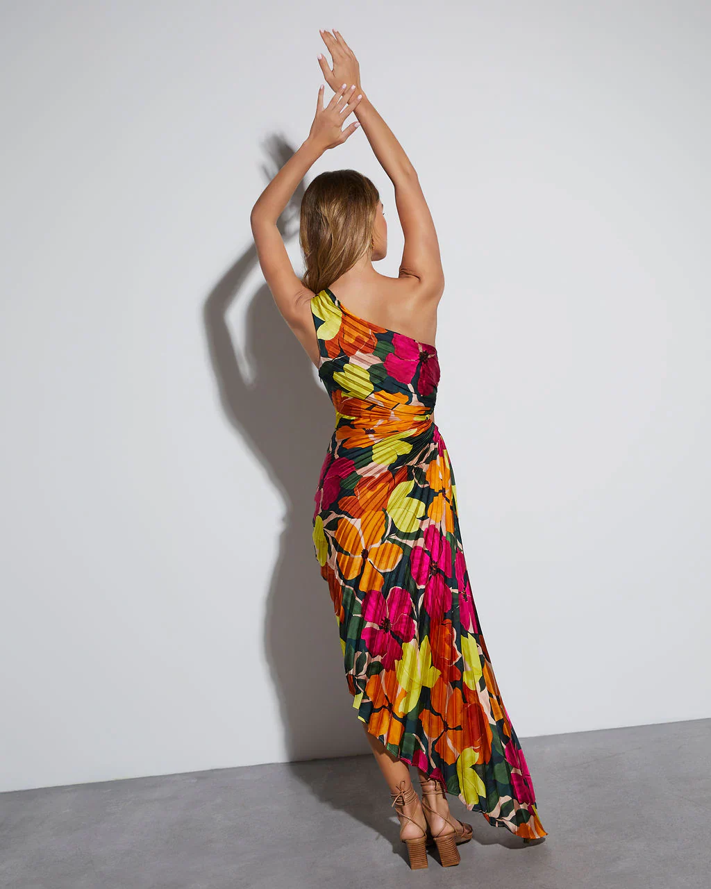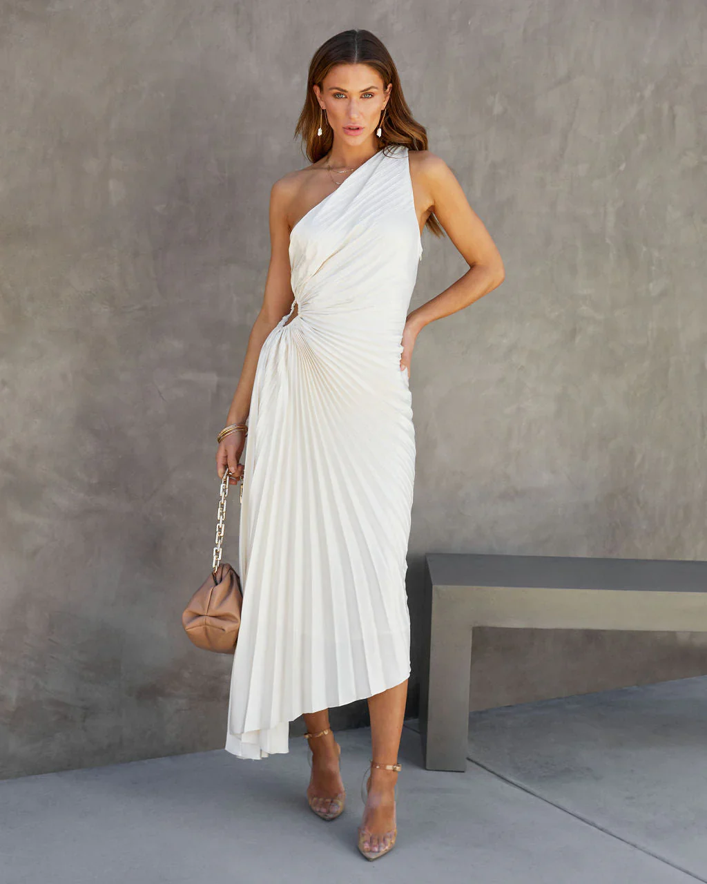 Modern Day Glam Satin Pleated One Shoulder Cutout Asymmetrical Maxi Dress
