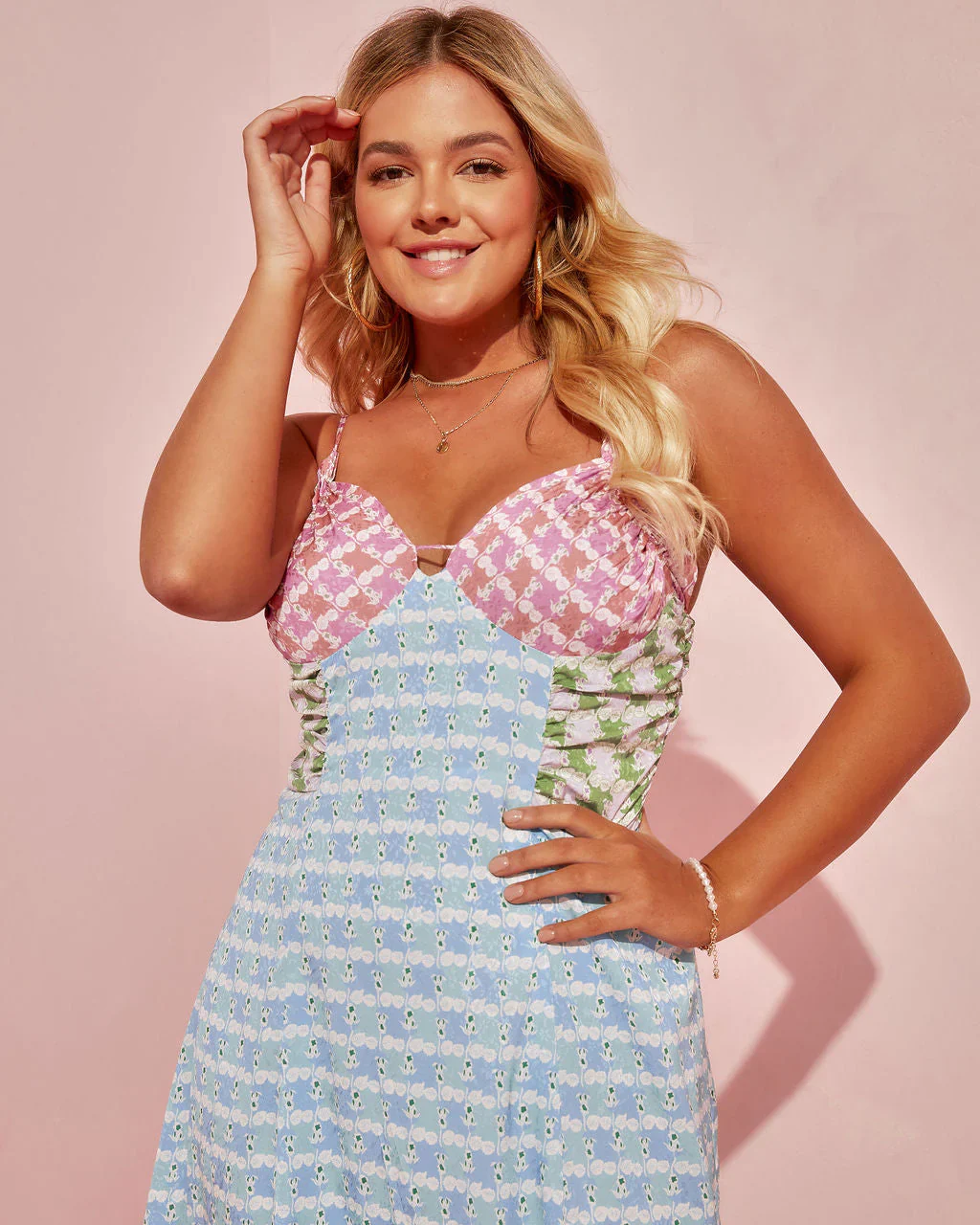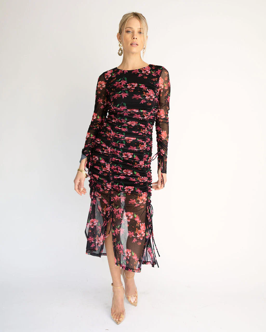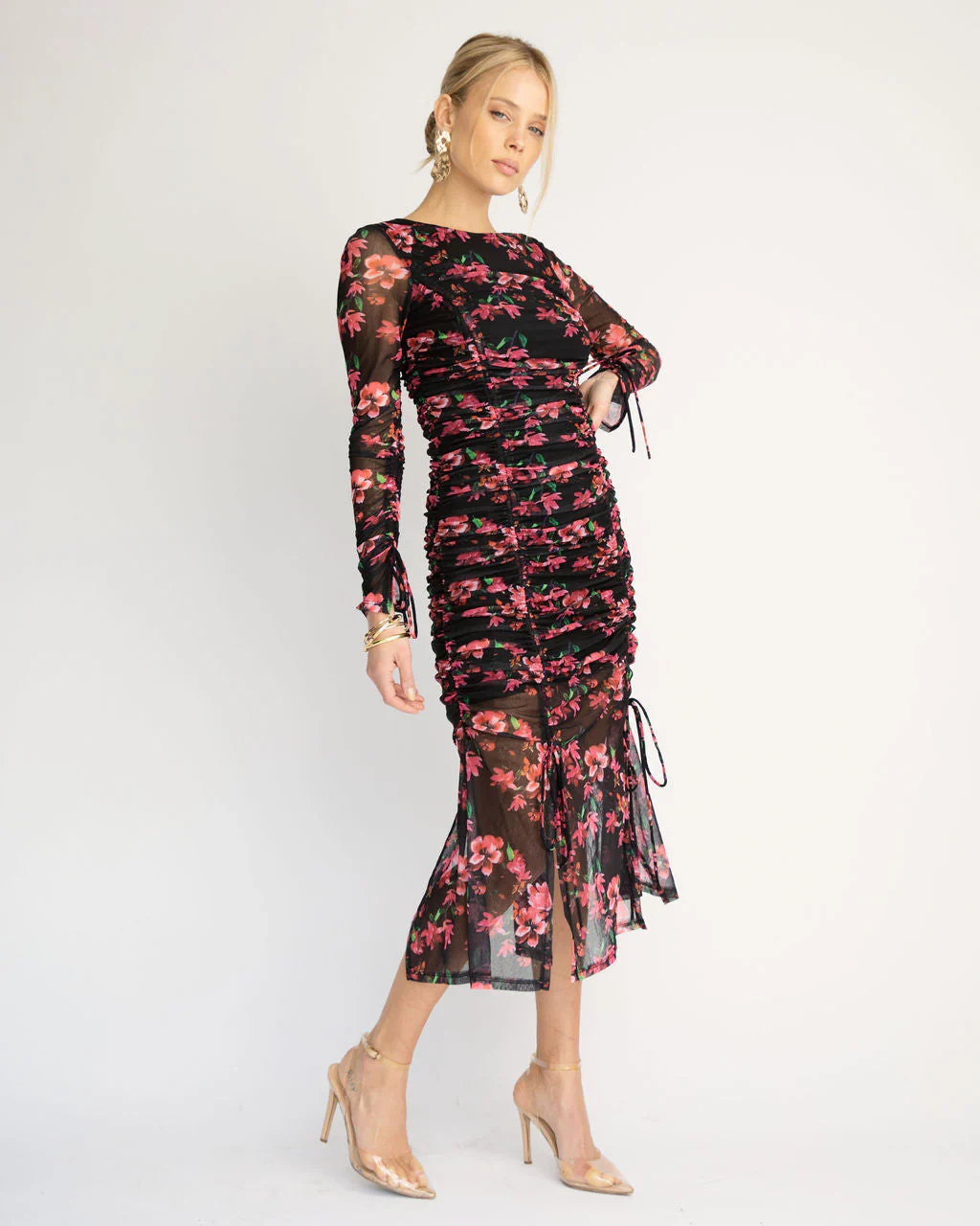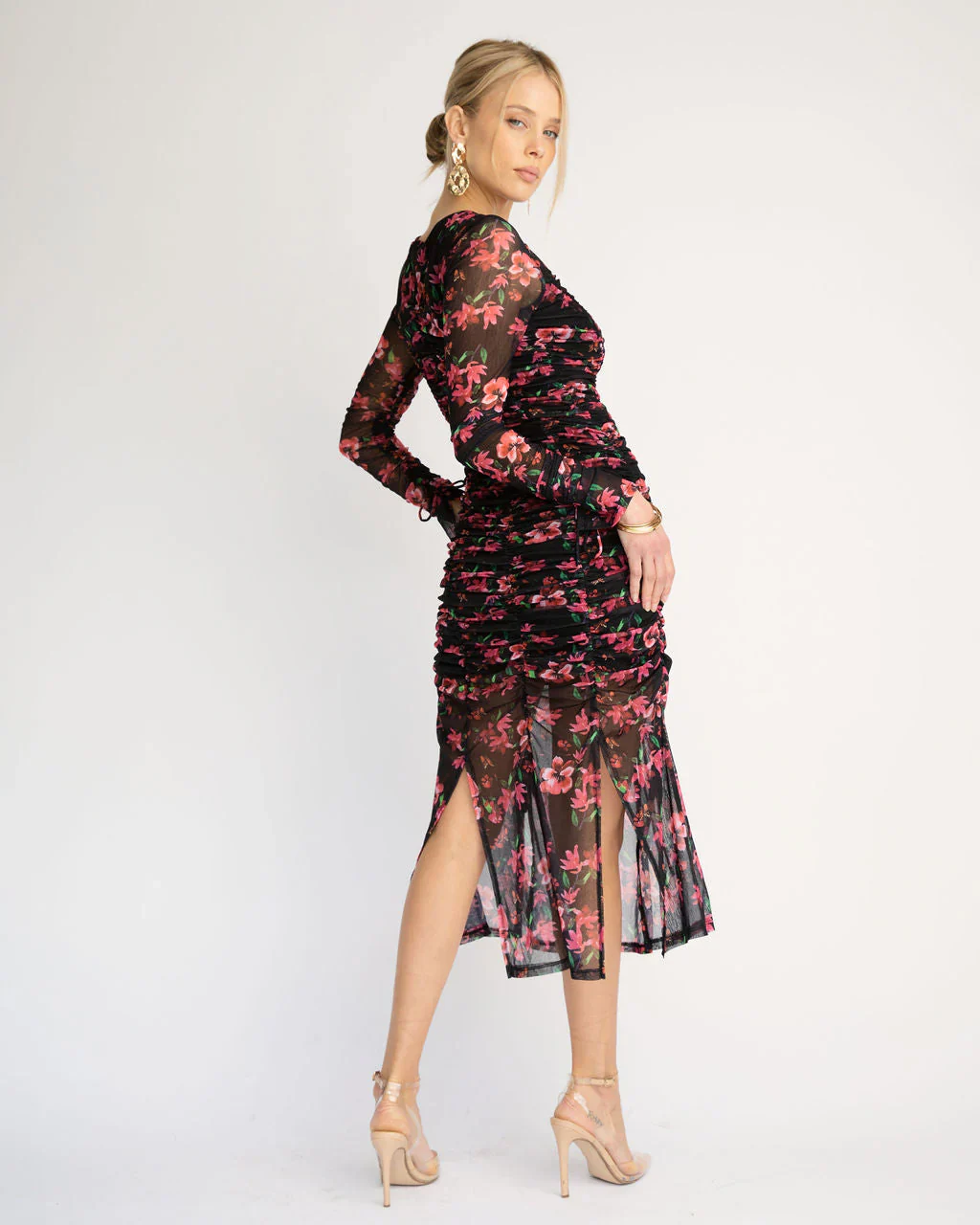 Soul Sister Ruched Floral Mesh Midi Dress